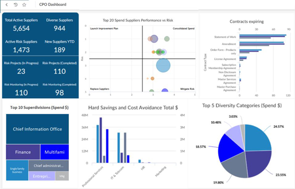 Das Ergebnis ist ein fokussiertes, benutzerfreundliches Dashboard, das eine Echtzeit-Gesamtansicht der Metriken des Beschaffungsprozesses (vom Vertragsmanagement über das Ausgabenmanagement bis zur Leistung der Lieferanten und mehr) bietet, mit der Möglichkeit, zwischen Ansichten von Maßnahmen in Berichten zu detaillierten Transaktionsdaten zu wechseln.